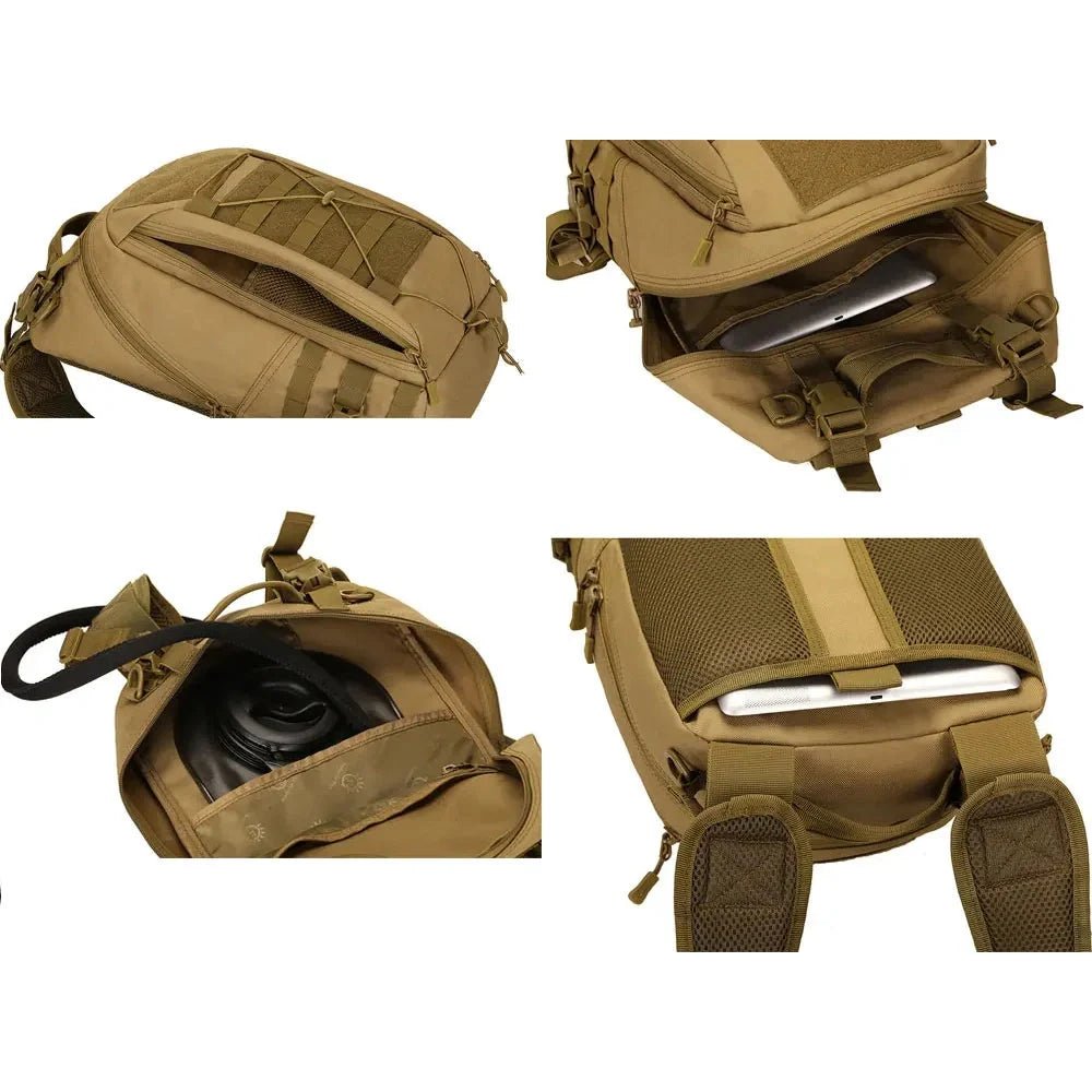Doté d'un système MOLLE et d'anneaux de fixation, il permet une personnalisation complète avec des équipements supplémentaires. Ses multiples poches et son cordon élastique facilitent l’organisation du matériel, et il est compatible avec une poche d'hydratation de 2,5L.