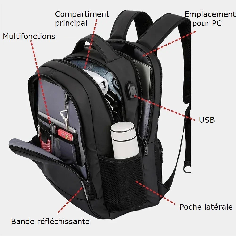 Notre sac à dos noir pour homme est conçu pour répondre à tous vos besoins. Il dispose de plusieurs poches zippées renforcé, facilement accessibles, idéales pour y glisser vos objets les plus utilisés. Doté de deux grand compartiments pour une capacité totale de 25 à 30 L, sa poche principale, est parfaite pour ranger des dossiers, des livres ou même des vêtements de rechange. Un emplacement dédiée protégera votre un ordinateur portable de 15,6 à 17 pouces selon le modèle et protégera votre pc des chocs et des rayures.