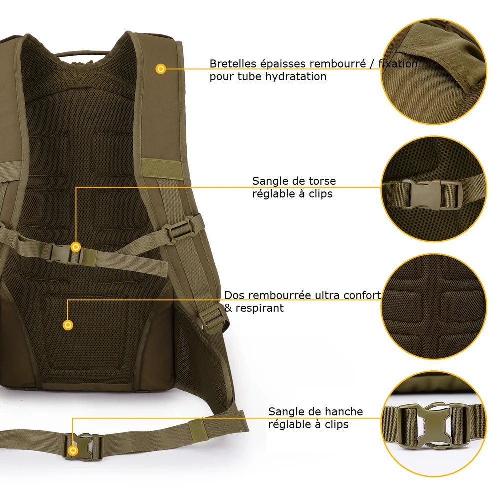 - Autres : système de fixation multiples MOLLE / sangle à clips de serrage/ bandes à patch/scratch / possibilité d'y placer une poche d'hydratation de 2,5L